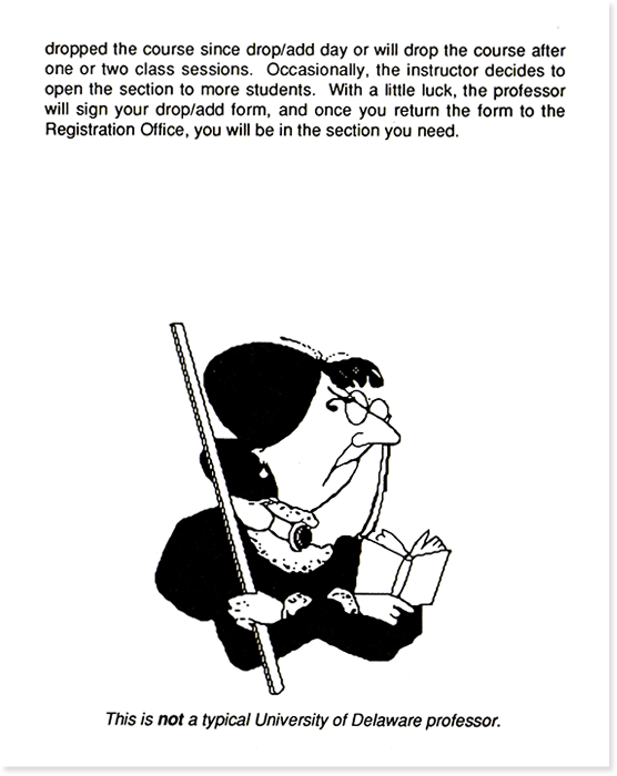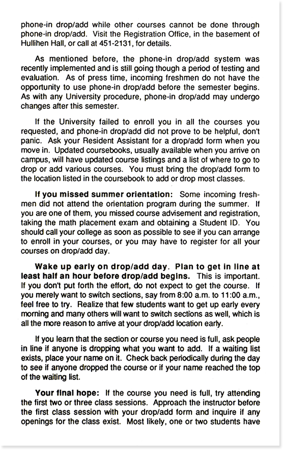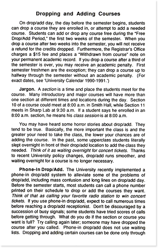 Below are the "Dropping and Adding Courses" scanned interior pages from the 1990 / 1991 edition of the PBH, courtesy and copyright of Marc D, UD '91.
