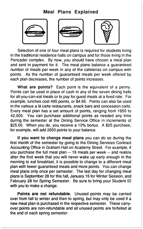 Below are the "Meal Plans Explained" scanned interior pages from the 1990 / 1991 edition of the PBH, courtesy and copyright of Marc D, UD '91.